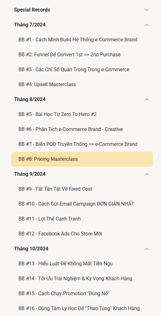 Bạn có thể thấy, đa số nội dung của Brand Builders sẽ xoay quanh Sales & Marketing - là thứ mình giỏi nhất. Nó sẽ khá ít các nội dung khác - ví dụ về quản trị, fulfillment, vận hành, v.v…